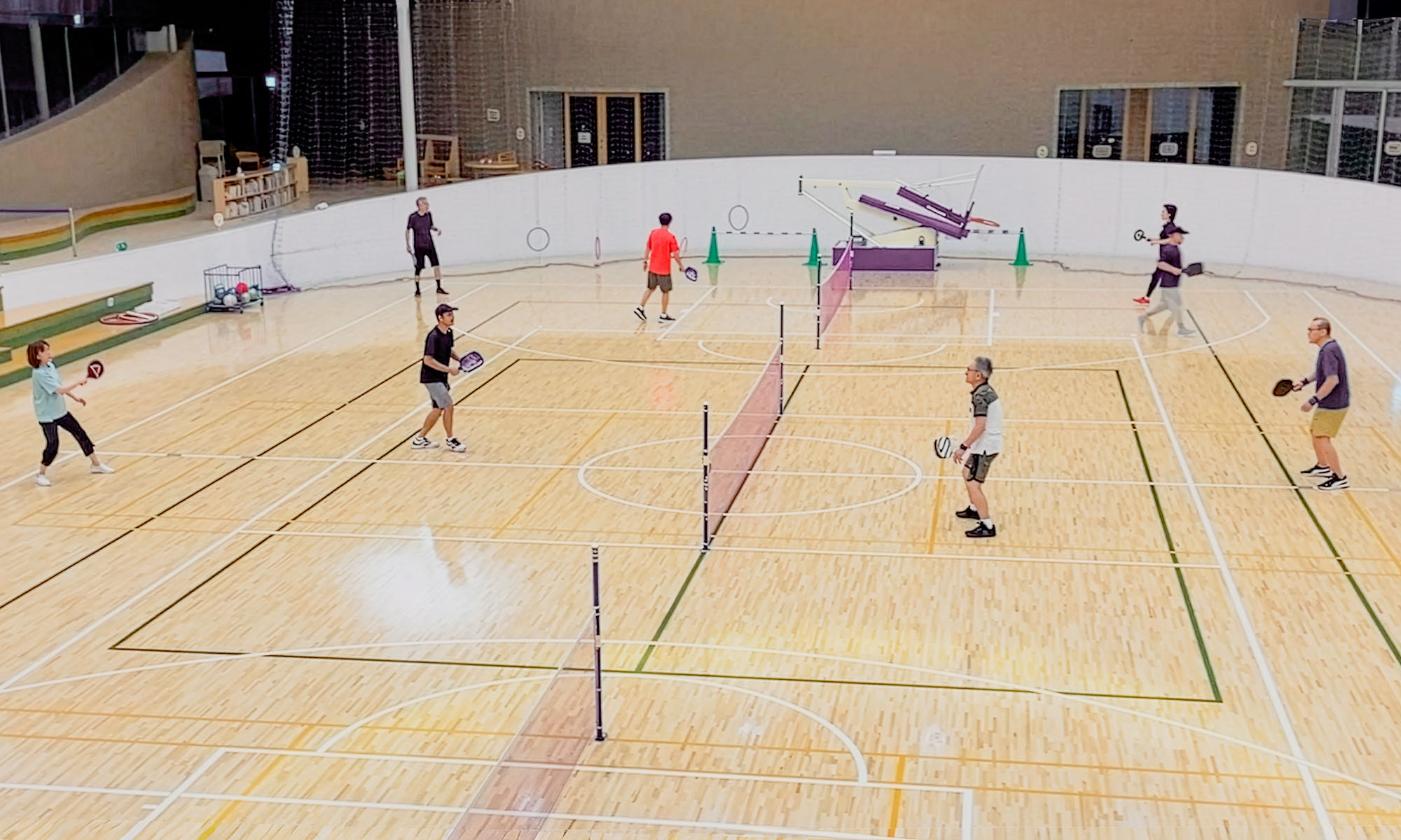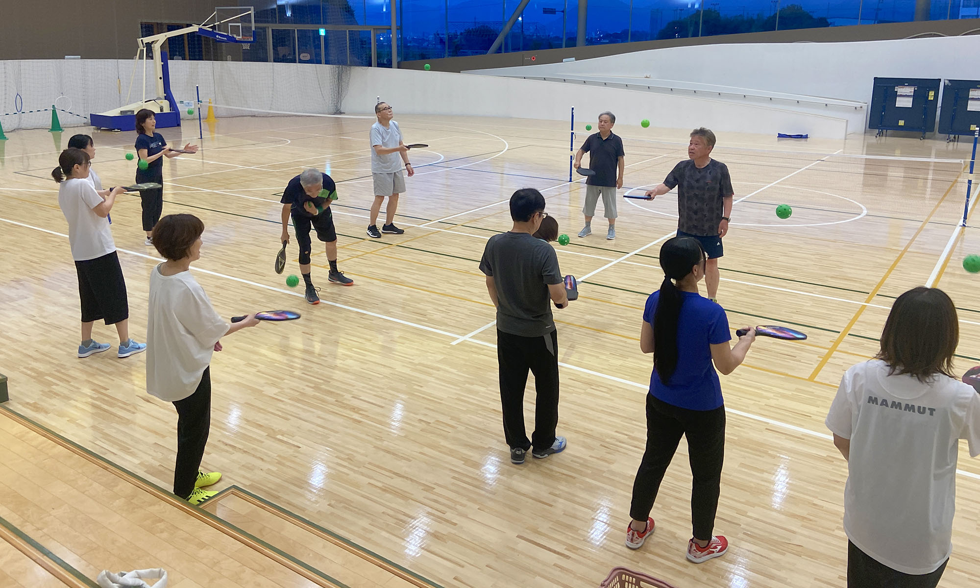 - ダブルス中心の活動: バドミントンコートと同じ広さのコートを使い、主にダブルスで和気あいあいとプレーしています。
